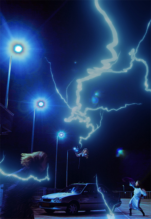 Right after that I started to create the second image, unable to let the story go. The small alien shaped TV which is portrayed in all the pictures, started to become the centre point of the series. What would happen if the little TV would actually be a portal to this supernatural, burning new world? My philosophical approach turned into a more wild, SciFi idea and ‘Burn, focus with a thirst unnatural’ was born.